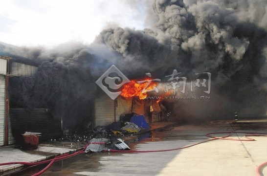 据隆阳区公安消防大队介绍,下午4时47分,他们出动26名官兵赶赴火灾现场时,大火已将整个仓库重重包围,火舌席卷着室内的_可燃物,屋顶外有数米高的火焰蹿出,库房内还不断传出“噼里啪啦”的响声。由于仓库内堆放着大量的塑料袋和塑料制品等易燃物,火势蔓延迅速,顷刻间已“吞噬”了相连的十余间商铺。随即,保山市公安消防支队又迅速调集车辆及30余官兵火速赶赴现场增援。